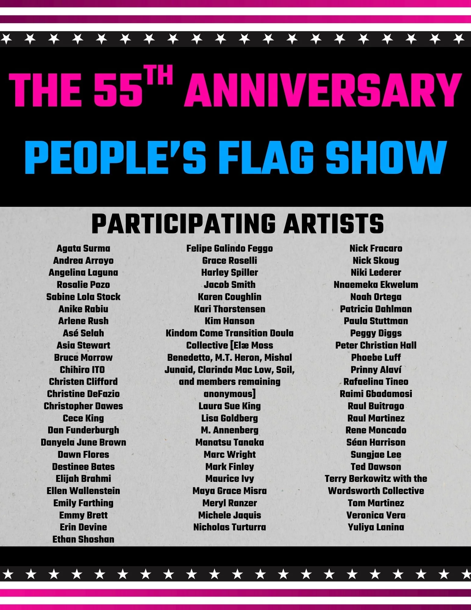 Beth Abaravich, Cathy Akers, Jerri Allyn, Claressinka Anderson, Amanda Maciel Antunes, Lani Asuncion, Tricia Avant, Renée Azenaro, Gianna Ayora, Therese Bachand, Launa Bacon, Holly Boruck, Lauren Bradshaw, Polly Breckenridge, Amelia Briggs, Ursula Brookbank, Nancy Buchanan, Alicia Byler, Karen Carrie, Wai Yan Cheung, Andrea Biller Collins, Anne Colvin, Karin Crona, Sydney Croskery, Paola Daniele, Laura Darlington, Emilie Dashe, Nicole Daskas, Cherie Benner Davis, Chelsea Dean, Kim Degen, Jessica Dillon, Jessica Dolence, Lala Drona, Sleepy Ephem, Alexis Espinosa, Diana Sofia Estrada, Trisha Faye, Lea Feinstein, Rachel Finkelstein, C. Finley, Luka Fisher, Michelle Francescon, Malado Francine, Dwora Fried, Marisa J. Futernick, Vivian Geilim, Yves B Golden, Lindsay Goltz, Sarah Green, Kristy Higby, Michele Jaquis, Shalla Javid, Yvonne Jongeling, Sharon Kivland, Grace Kredell, Karolina Lavergne, Elizabeth Leister, T. Charnan Lewis, Aubrey Ingmar Manson, Aline Mare, Kelly Marie Martin, Lilly McElroy, Brooke McGowen, Tom McLaughlin, Alyce Haliday McQueen, Siofra McSherry, Memoticon, Mother Art, Mehregan Pezeshki, Minna Philips, Jennifer Pilch, Melissa Potter, Alison Pirie, Mary Anna Pomonis, Ali Prosch, Fiona Quilter, Heather Rasmussen, Fay Ray, Cindy Rehm, Chelsea Revelle, Michelle Robinson, Yasamin Safarzadeh, Jinal Sangoi, Hannah Scott, Safi Alia Shabaik, Peggy Sivert, Frances Smokowski, Felís Stella, Allison Stewart, Kayla Tange, Celeste Voce, Danielle Giudici Wallis, Rebecca Waring-Crane, Susan J. White, Elizabeth C. Wild, Julie Zemel